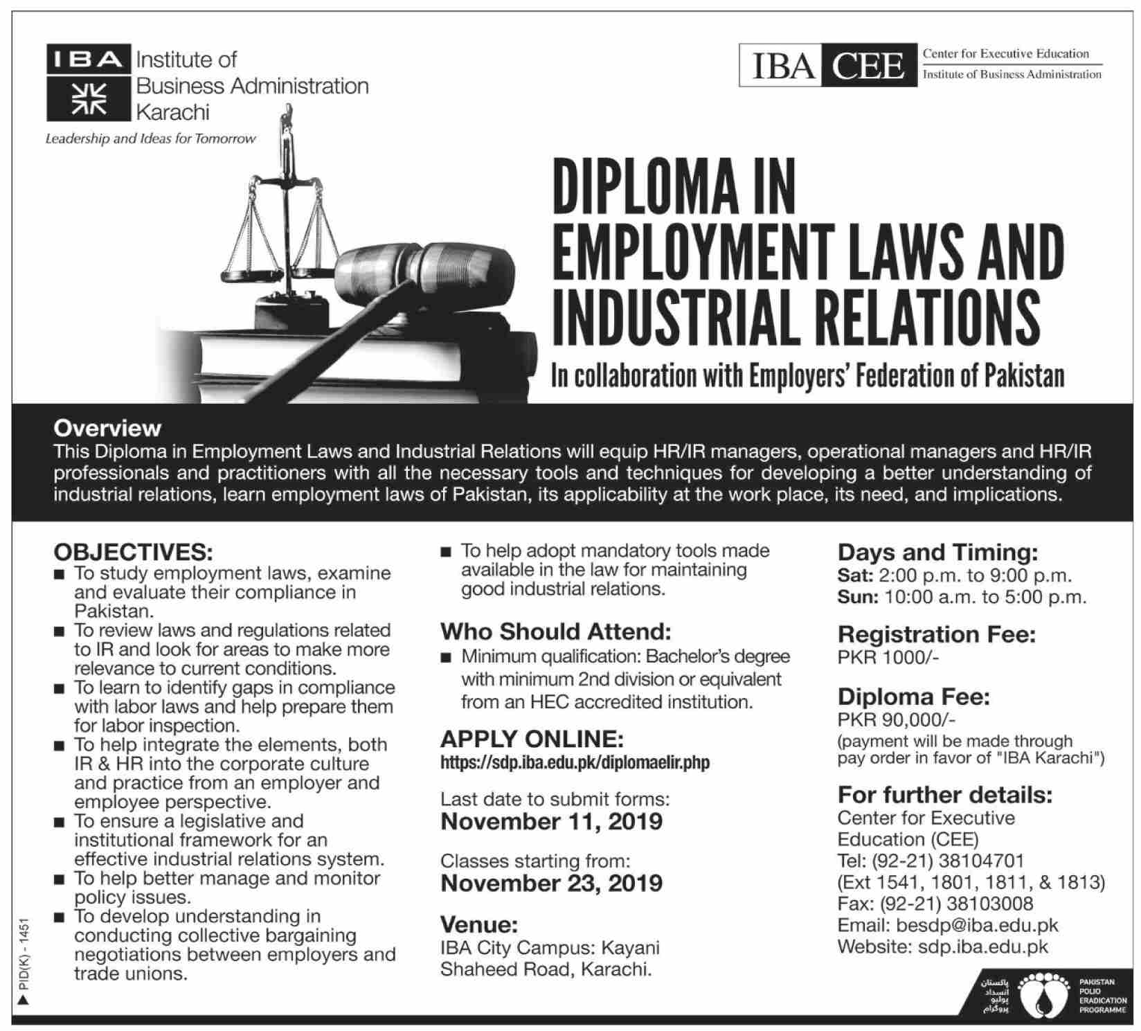 Institute of Business Administration Karachi has announced admissions for Diploma in Employment Laws and Industrial Relations In collaboration with Employers Federation of Pakistan. Last date for submission of forms is 11 Nov 2019. Classes starting from 23 Nov 2019.