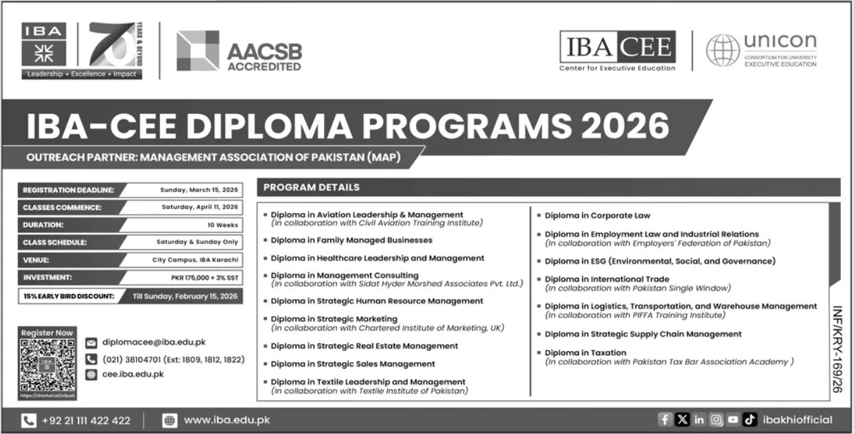 As an AACSB-accredited institution, the Institute of Business Administration continues its 70-year legacy by offering specialized training in collaboration with prominent global and local partners, including the Chartered Institute of Marketing UK and the Management Association of Pakistan MAP. For those looking to apply online, the 2026 intake features 16 specialized diplomas tailored to high-growth sectors.