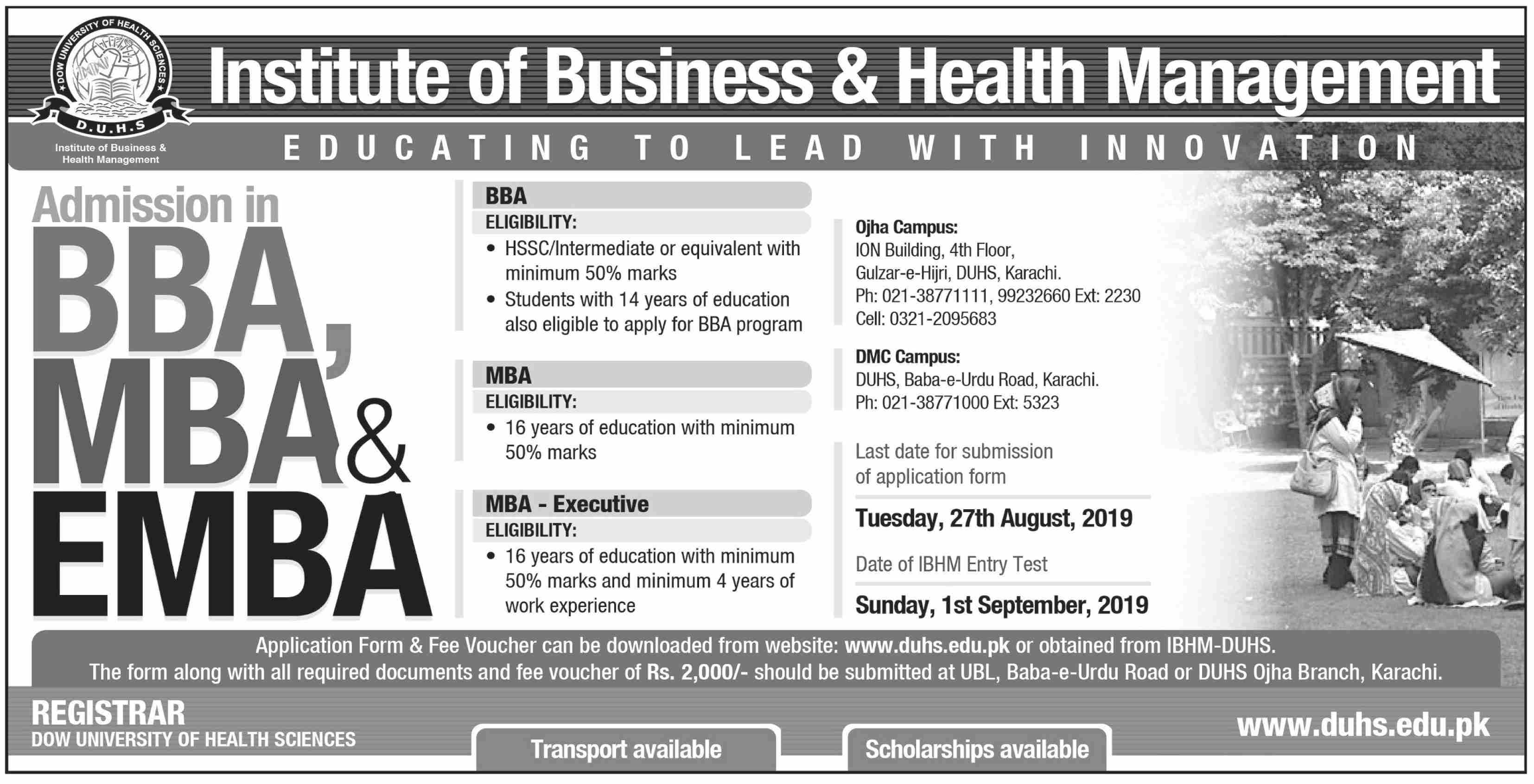 Institute of Business & Health Management has announced admissions in BBA, MBA and EMBA in Karachi.