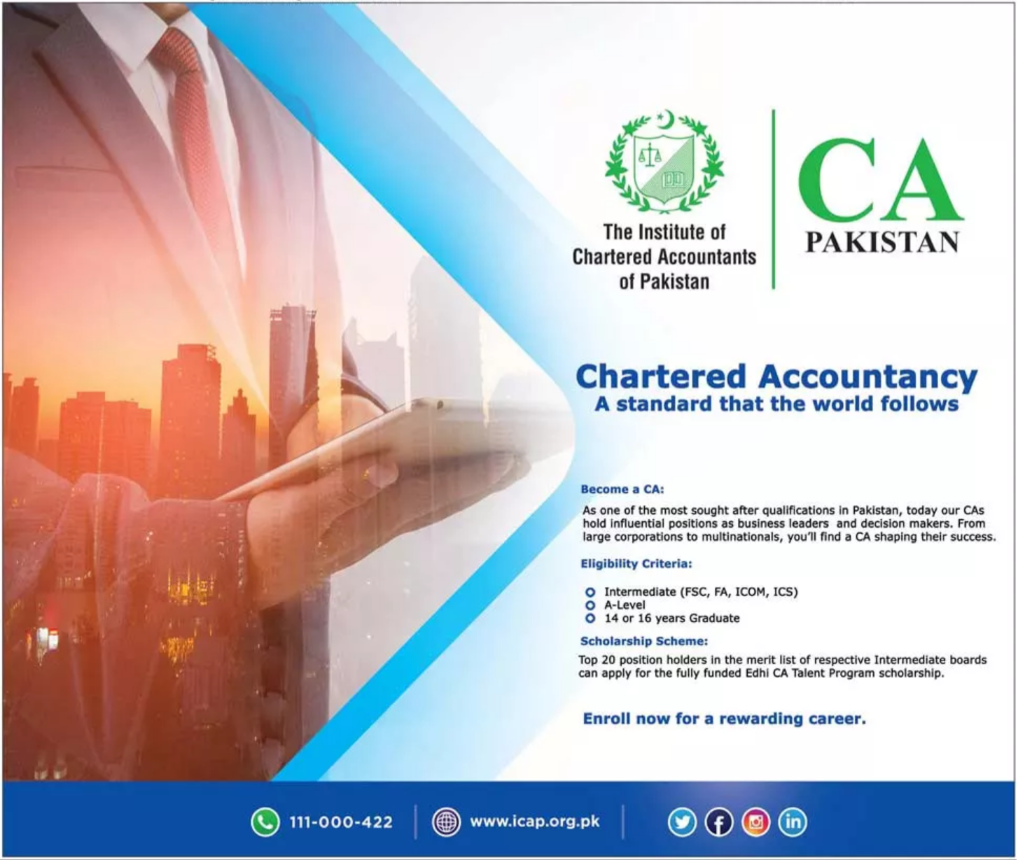 Institute of Charted Accountants of Pakistan has announced admission for CA Charted Accountant. Eligibility Criteria: FSc, FA, ICS, A-Level, 14 or 16 year Graduate. Scholarships are available.