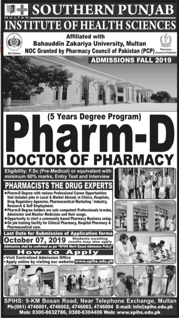Institute of Health Sciences Multan has offered admissions for 5 year Pharma D Program. FSc Pre-Medical with 60% marks are eligible to apply, Entry test & Interview. Last date for submission of admission applications 07 Oct 2019.