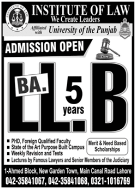 Institute of LAW has offering the admissions 2020 in BA LLB(5 Years) Program in Lahore.