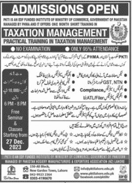 The Pakistan Funded Institute of Ministry of Commerce stands as a beacon of professional development in collaboration with the Pakistan Hosiery Manufacturers & Exporters Association PHMA. Managed by the Public Housing Authority PHA, this institute offers an exceptional opportunity for individuals seeking to advance their expertise in taxation management through a one-month short training program.