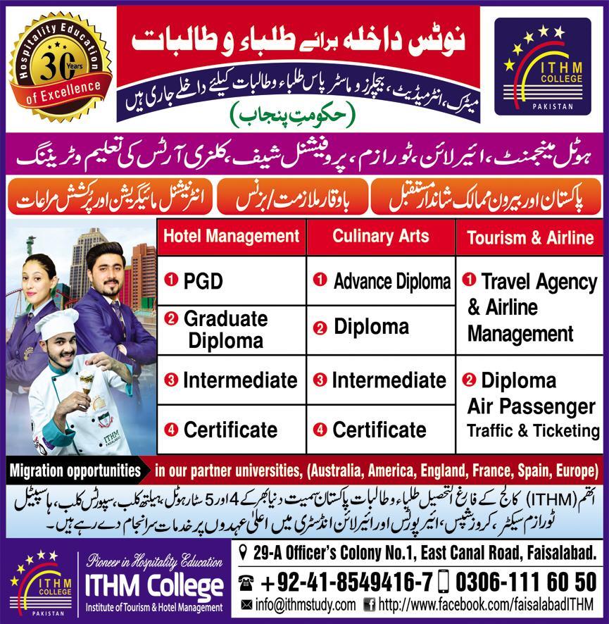 Institute of Tourism & Hotel Management announced the Admission for the session of 2020. The Institute of Tourism & Hotel Management has now starts the Admission in the Courses of PGD, Advance Diploma , graduate Diploma, Diploma, Travel Agency & Airline Management, Intermediate, Diploma Air Passenger.The last date of submission of form is 29th February, 2020.