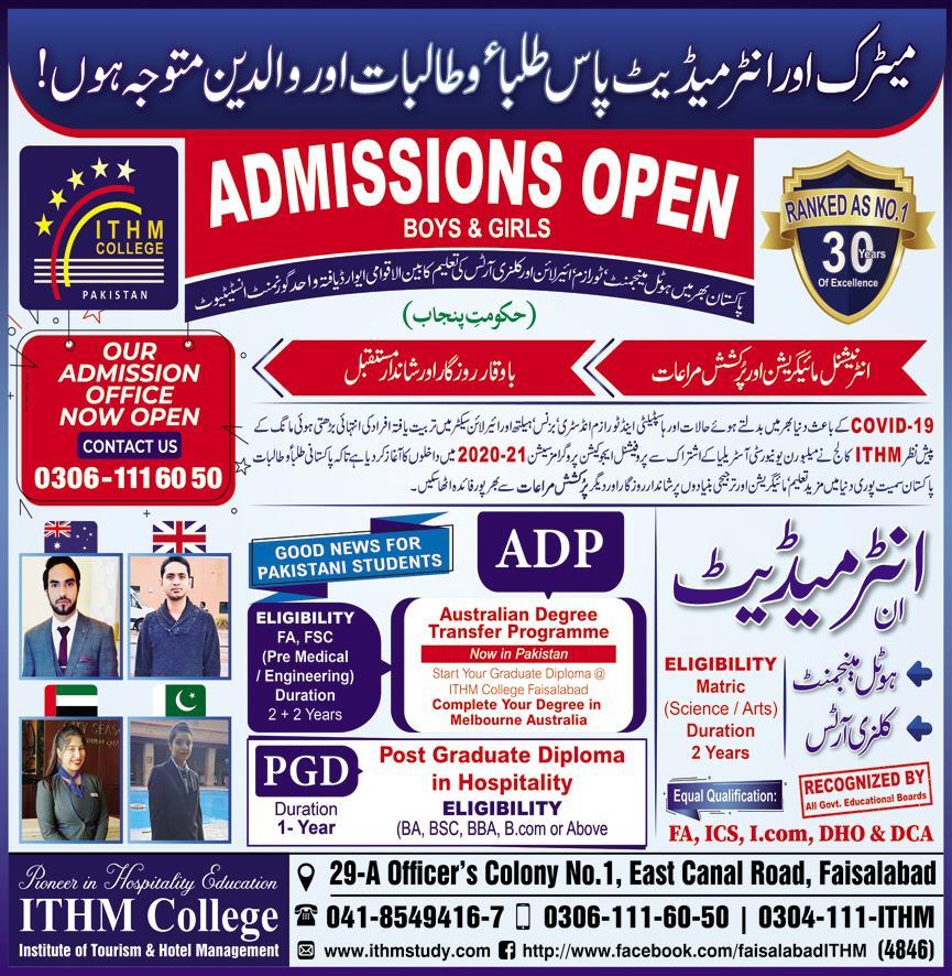 Institute of Tourism & Hotel Management ITHM has announced admissions 2020 in Inter Hotel Management, Culinary Arts, Post Graduate Diploma in Hospitality in Faisalabad.