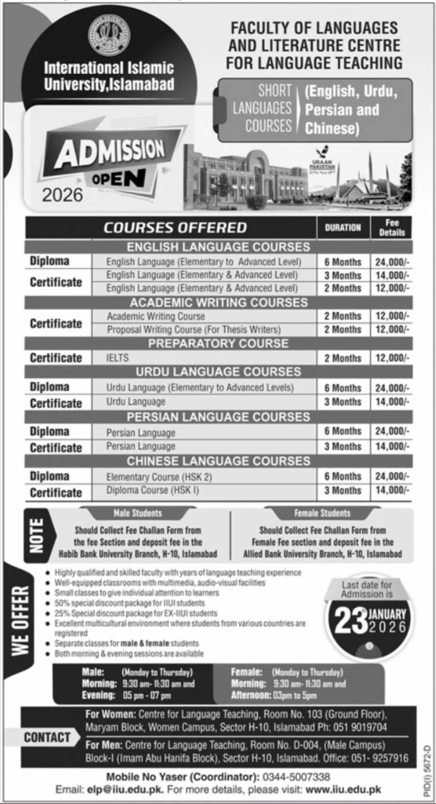 The International Islamic University Islamabad has officially announced Admissions 2026 through its Faculty of Languages and Literature, Centre for Language Teaching. Admissions are now open for short language courses, certificate programs, and diploma programs, offering students and professionals an excellent opportunity to enhance their linguistic and academic skills in a prestigious university environment.