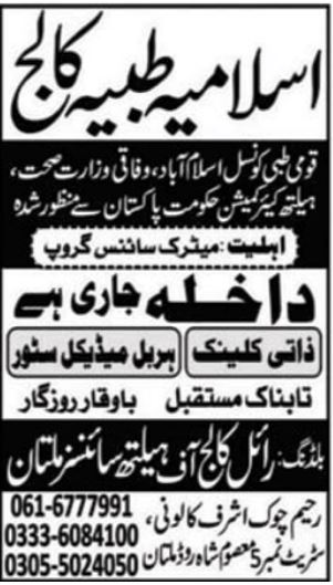 Islamia Tibya College Multan offers admissions in 2022 for the program of Tib. The criteria for admission is Metric with the science group. Candidates who have any queries can call the numbers given in the ad below. Islamia Tibya College Is approved by the National Tib Council. Candidates who are interested in taking admission should not waste any time and call the numbers in the ad below and secure their seat in Islamia Tibya Council.