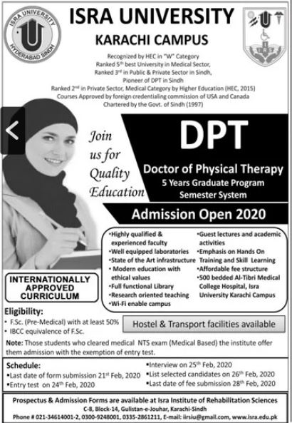 Isra University Karachi Campus Admission 2020 announced for the class of DPT Doctor of Physical Therapy. The Students of Isra University Karachi Campus can now get their Admission form before the last date 21st February, 2020.