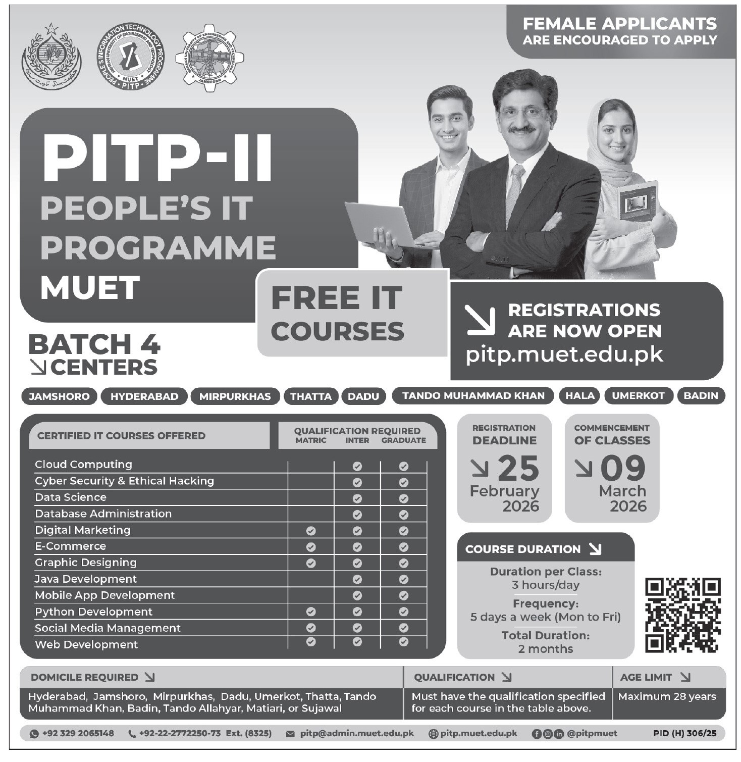 The Mehran University of Engineering and Technology has officially announced the commencement of Batch 4 for the Peopleās IT Programme PITP-II. This initiative, aimed at bridging the digital divide in Sindh, offers a significant opportunity for residents to acquire market-driven skills through specialized MUET Courses 2026. By providing high-quality, free IT training, the university continues its mission to empower the youth with technical expertise essential for the modern global economy.