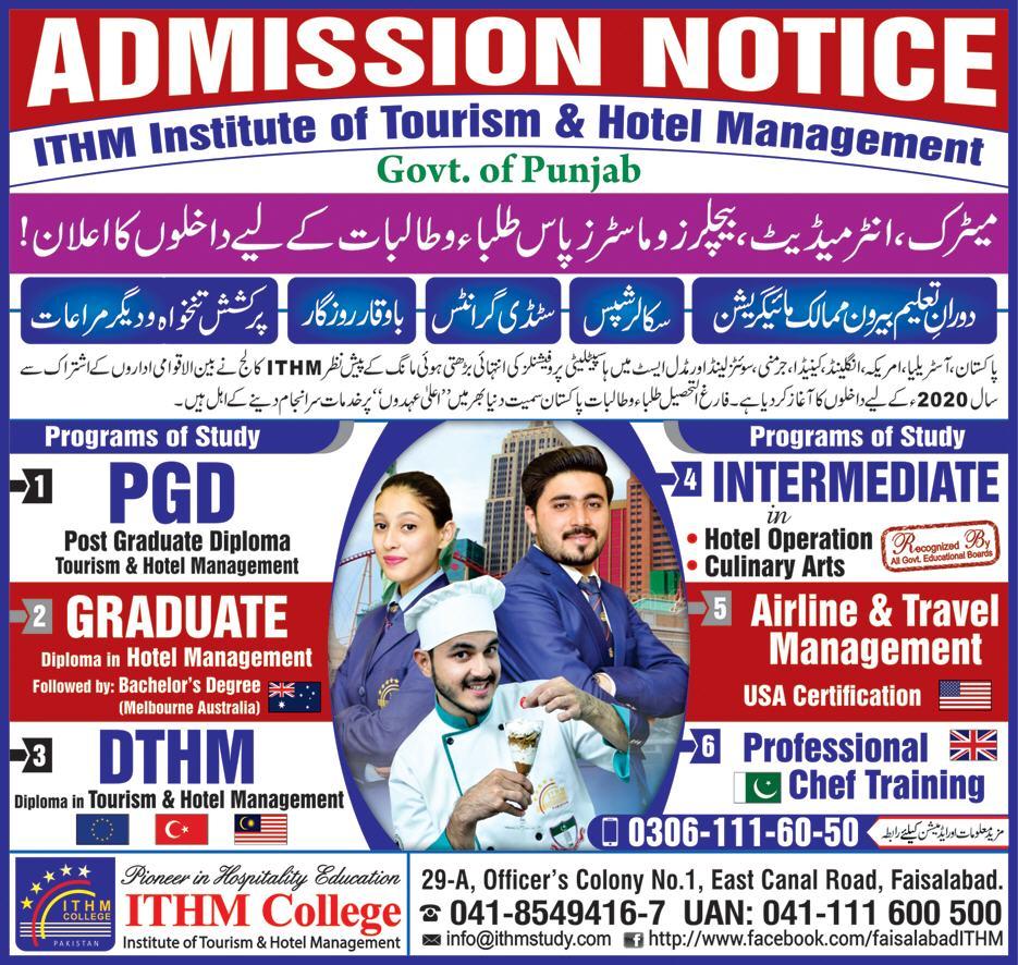 Ithm Institute of Tourism & Hotel Management Faisalabad has announced admissions for PGD Postgraduate Diploma in Tourism & Hotel Management, Diploma in Hotel Management, Intermediate in Airline & Travel Management.