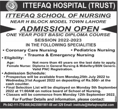 Ittefaq Hospital Trust Lahore, Ittefaq College of Nursing, is taken the step to announced the Ittefaq Hospital Trust Admissions 2022 and looking for Applications from interested candidates for Ittefaq Hospital Trust Lahore Admissions 2022 in Diploma Programmes for Academic Session 2022. Ittefaq Hospital Trust Diploma Admissions 2022 are announced in One Year Post Basic Diploma Course Admissions 2022 in Coronary Care Nursing, Pediatrics Nursing, Trauma and Emergency Nursing. Candidates should send their Applications for Admissions with effect from July 25, 2022. Admissions are open.