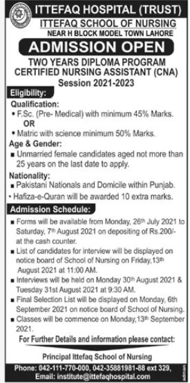 Ittefaq Hospital Trust Lahore, Ittefaq School of Nursing, has opened Admissions and inviting Applications to Aspirants for Admissions of Diploma in Certified Nursing Assistant CNA for Academic Session 2021-2023. Candidates having FSc Pre-Medical with minimum 45% marks or Matric with Science with 50% marks are eligible to apply. Interested candidates can collect from forms July 26, 2021. Last date to apply is August 07, 2021. Admissions are open for Academic Year 2021. Classes are commencing from September 13, 2021.