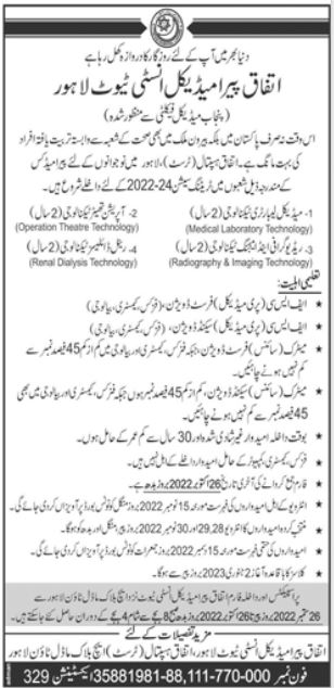 Ittefaq Paramedical Institute Lahore Admissions 2022