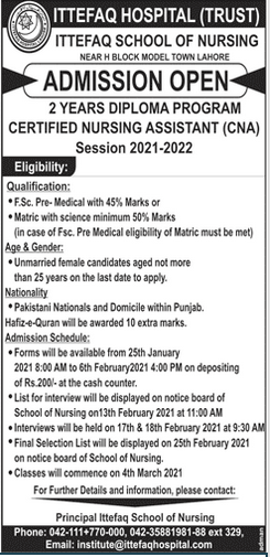Ittefaq School Of Nursing has offered Admissions in 2 years Diploma Program Certified Nursing Assistant (CNA) for the session of 2021-22.Application form for Admission will be available from 25-01-2021.
