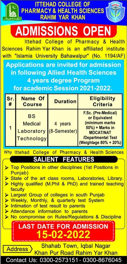 Ittehad College Of Pharmacy BS Admissions 2022 are being offered to Aspirants who want to take admissions in ICPHS Rahim Yar Khan. Applications are invited for ICPHS Rahim Yar Khan Admissions 2022 in BS Medical Laboratory Technology under duration of 4 Years for Academic Session 2021-2022. Candidates passed FSc Pre-Medical or equivalent with minimum 50% marks are allowed to apply for ICPHS Rahim Yar Khan BS Admissions 2022. Candidates who want to take ICPHS Admissions 2022 in BS Program are required to send applications on or before February 15, 2022. ICPHS BS MLT Admissions 2022 are ongoing.