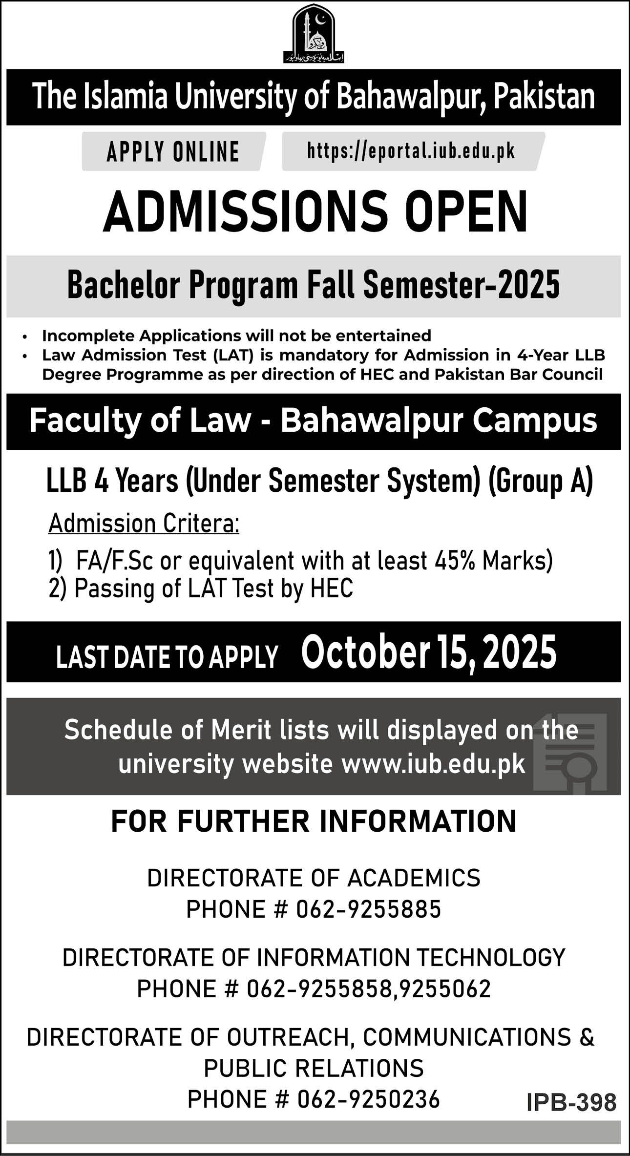 The Islamia University of Bahawalpur IUB is pleased to announce admissions for the Fall Semester 2025 in the 4-Year LLB Bachelor of Laws Program under the semester system. Aspiring candidates are invited to apply online for one of the most respected and in-demand professional degree programs in the country.