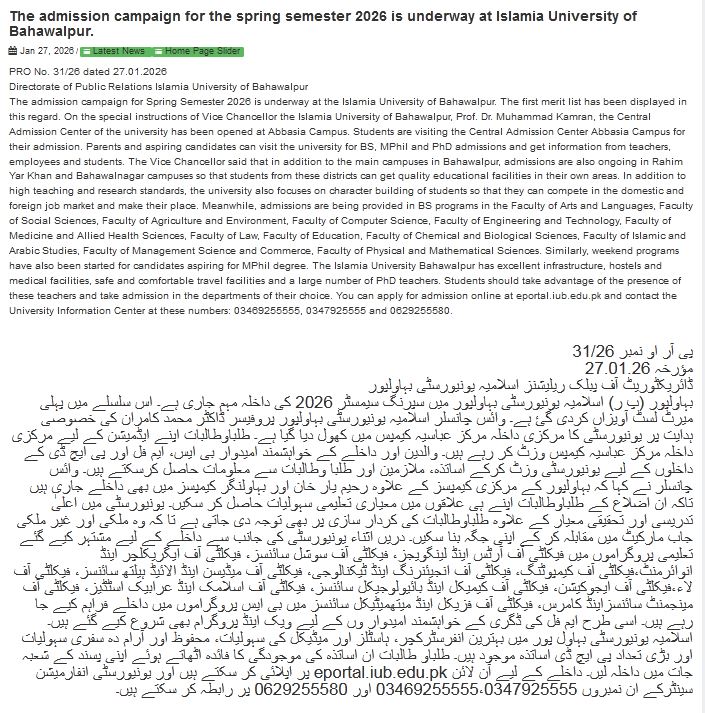 The admission process for the Spring Semester 2026 has officially begun at Islamia University of Bahawalpur IUB. The first merit list has already been published, and the Central Admission Center at Abbasiya Campus is now open for prospective students. Following the directives of Vice Chancellor, Prof. Dr. Muhammad Kamran, students are visiting the campus to submit applications and obtain guidance from faculty, staff, and current students. The students can get the fresh updates of IUB Launches Spring Semester 2026 Admissions.