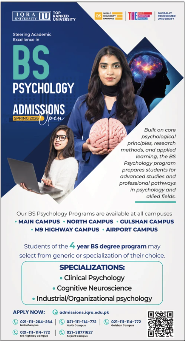 Iqra University, Islamabad IUISB has announced IUISL Admissions 2026, inviting aspiring students to join its top-ranked and globally recognized institution. Known for steering academic excellence, IU offers the BS Psychology Programs 2026 at all campuses including Main, North, Gulshan, M9 Highway, and Airport campuses. This four-year degree is designed to equip students with core psychological principles, research methods, and applied learning for advanced studies and professional pathways in psychology and allied fields.