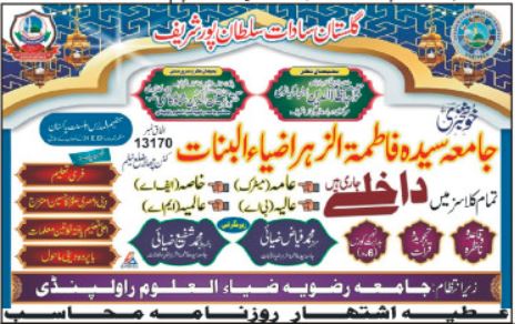The esteemed Jamia Syeda Fatima-tuz-Zahra Zia-ul-Banat has officially announced its admission intake for the academic session 2026. Under the umbrella of Jamia Razvia Zia-ul-Uloom Rawalpindi, this institution serves as a cornerstone for female religious and academic education. This year, the Jamia is inviting applications for a wide range of programs designed to provide a comprehensive understanding of Islamic sciences alongside contemporary studies.