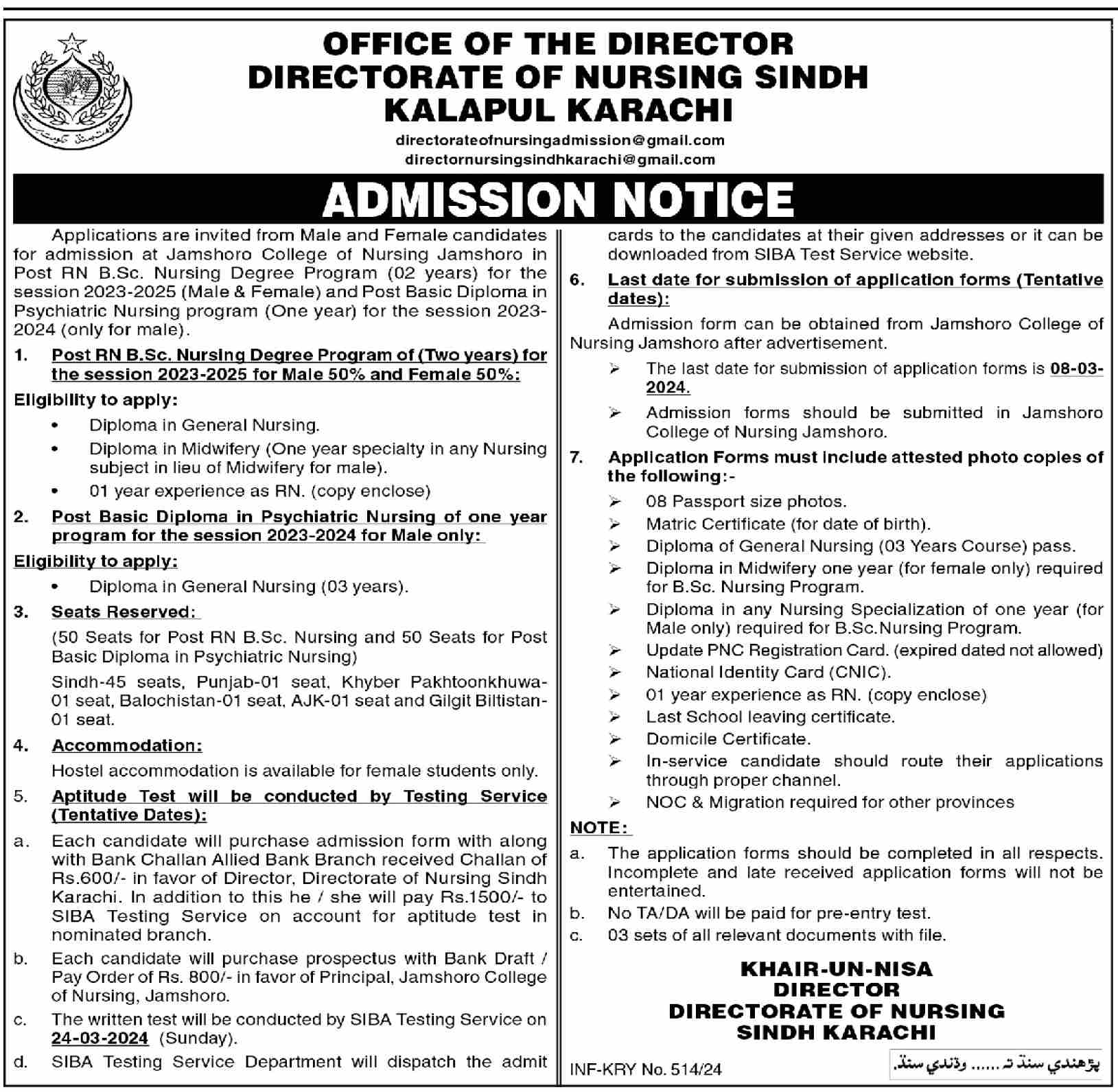 The Directorate of Nursing, Sindh, located in Kalapul Karachi, has issued a significant admission notice inviting applications from both male and female candidates for various nursing programs. The programs offered include the Post RN B.Sc. Nursing Degree Program 02 years and the Post Basic Diploma in Psychiatric Nursing program One year. This announcement presents a valuable opportunity for aspiring nurses to advance their careers and contribute to the healthcare sector. Lets delve into the details of the admission notice and the eligibility criteria for each program.