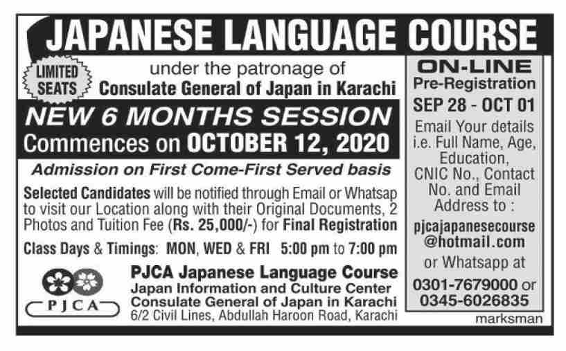 Japan Information and Culture Center is offering admissions 2020 in 6 months diploma in Japanese Language Course in Karachi Pakistan.