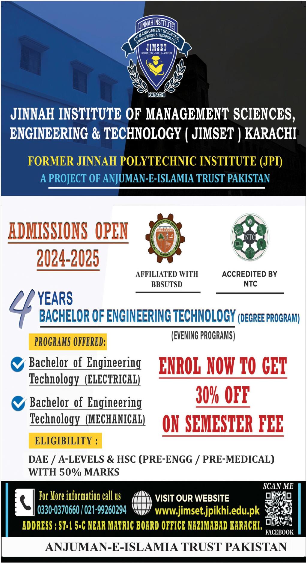 Jinnah Institute of Management Sciences, Engineering & Technology JIMSET in Karachi is now offering undergraduate admissions for the 2025 session in the fields of Electrical Engineering Technology and Mechanical Engineering Technology. These JIMSET Courses 2025 are designed to provide students with the technical expertise and hands-on experience necessary to succeed in the engineering industry.