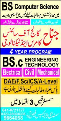 Jinnah College of Science Commerce and Technology has announced the admission for BSc Engineering Technology and DAE in Electrical, Civil, Mechanical in Faisalabad. College also offering the program of BS Computer Science.