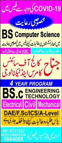 Jinnah College of Science Commerce and Technology Faisalabad has offered admissions for BS in Computer Science, BSc in Electrical, Civil, Mechanical Engineering Technology. Limited seats are available. Admissions are open.