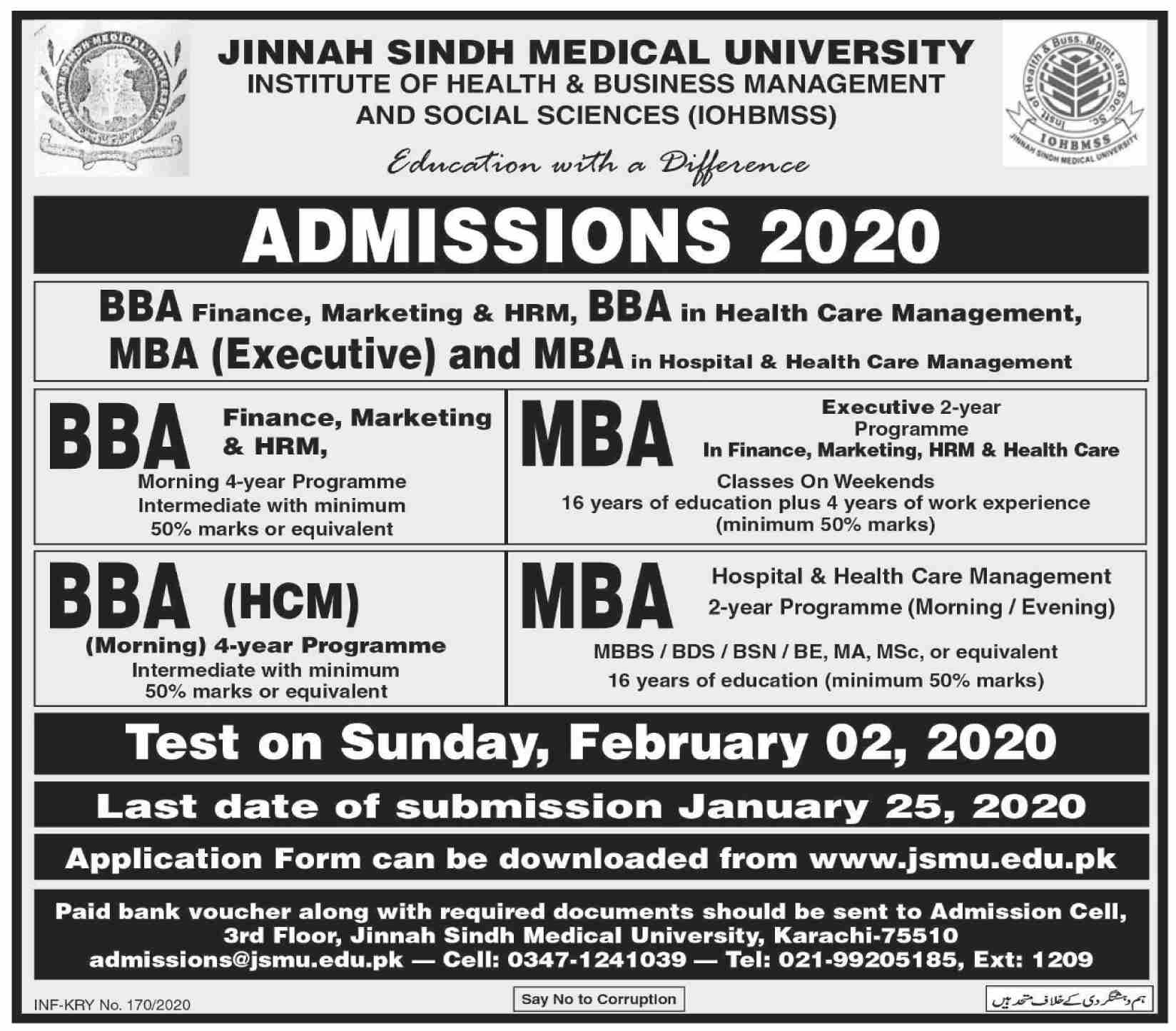 Jinnah Sindh Medical University BBA Admission 2020