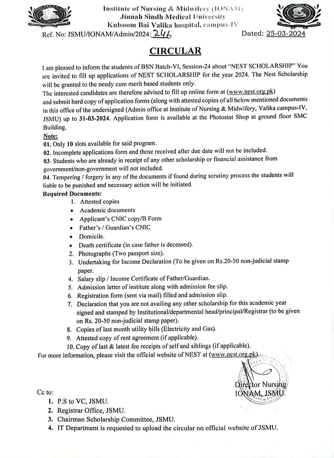 Jinnah Sindh Medical University JSMU continues its commitment to fostering academic excellence and supporting students in need through the prestigious NEST Scholarship 2024. As part of its ongoing mission to promote education and merit-based assistance, JSMU extends a warm invitation to the students of BSN Batch-VI, Session-24 to apply for this esteemed scholarship opportunity.