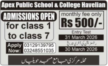 The educational landscape in Havelian continues to grow as Apex Public School & College Havelian officially announces its intake for the upcoming academic session. This announcement is a significant opportunity for parents seeking quality education at an affordable cost for their children. The school is currently accepting applications for multiple grade levels, ensuring a strong foundation for young learners in the region.