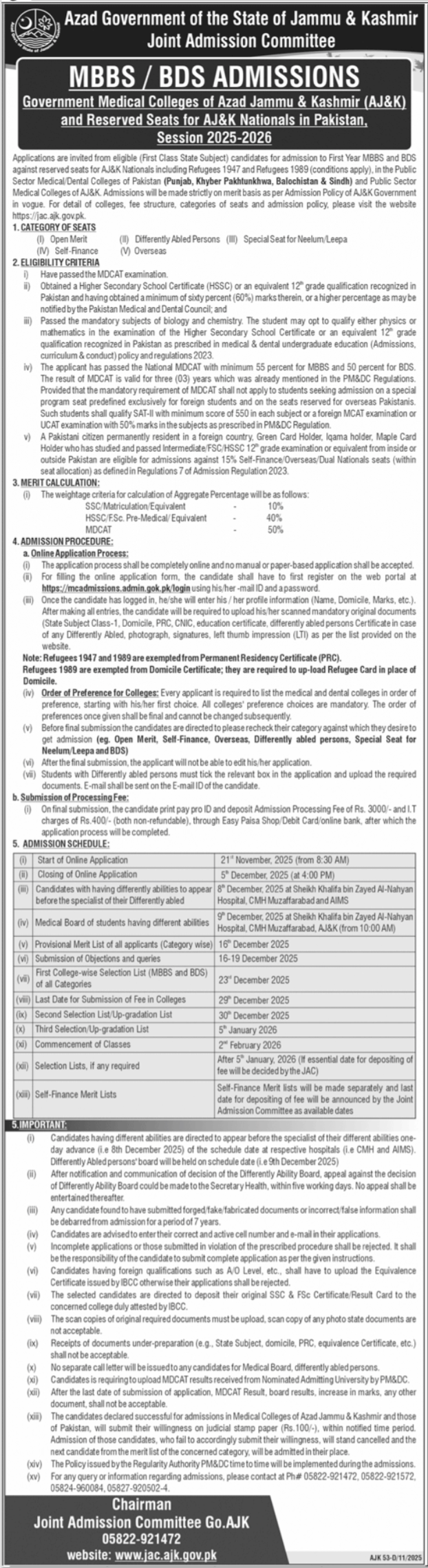 The Joint Admission Committee JAC of Azad Jammu & Kashmir AJ&K invites applications from eligible candidates for admission 2025-26 to First-Year MBBS and BDS programs in Government Medical Colleges of AJ&K and reserved seats for AJ&K nationals in Public Sector Medical/Dental Colleges of Pakistan Punjab, Khyber Pakhtunkhwa, Balochistan & Sindh. Admissions will be strictly merit-based as per the Admission Policy of the AJ&K Government.
