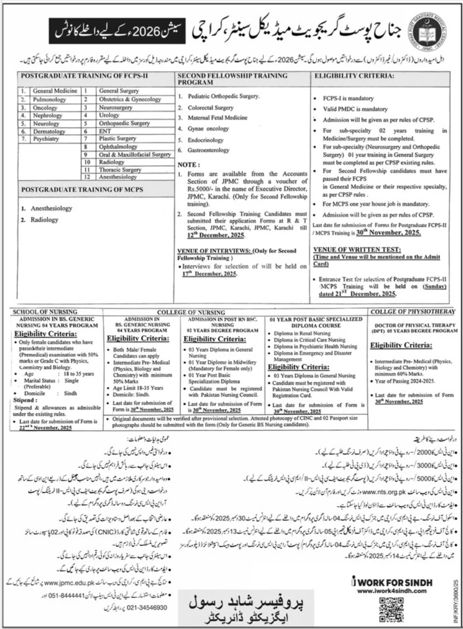 The Jinnah Postgraduate Medical Centre JPMC Karachi, one of Pakistan’s leading institutions in medical education and research, invites applications from eligible doctors and non-doctors for admission to various Postgraduate, Nursing, and Allied Health programs for the Session 2026.
