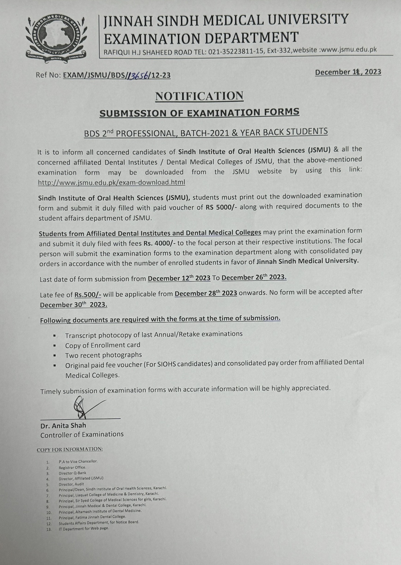 In a significant development, Jinnah Sindh Medical University JSMU has issued a crucial notification regarding the JSMU submission of examination forms for BDS 2nd Professional, Batch-2021, and year-back students. This announcement underscores the institutions commitment to ensuring a smooth academic process and the continued progress of its students.