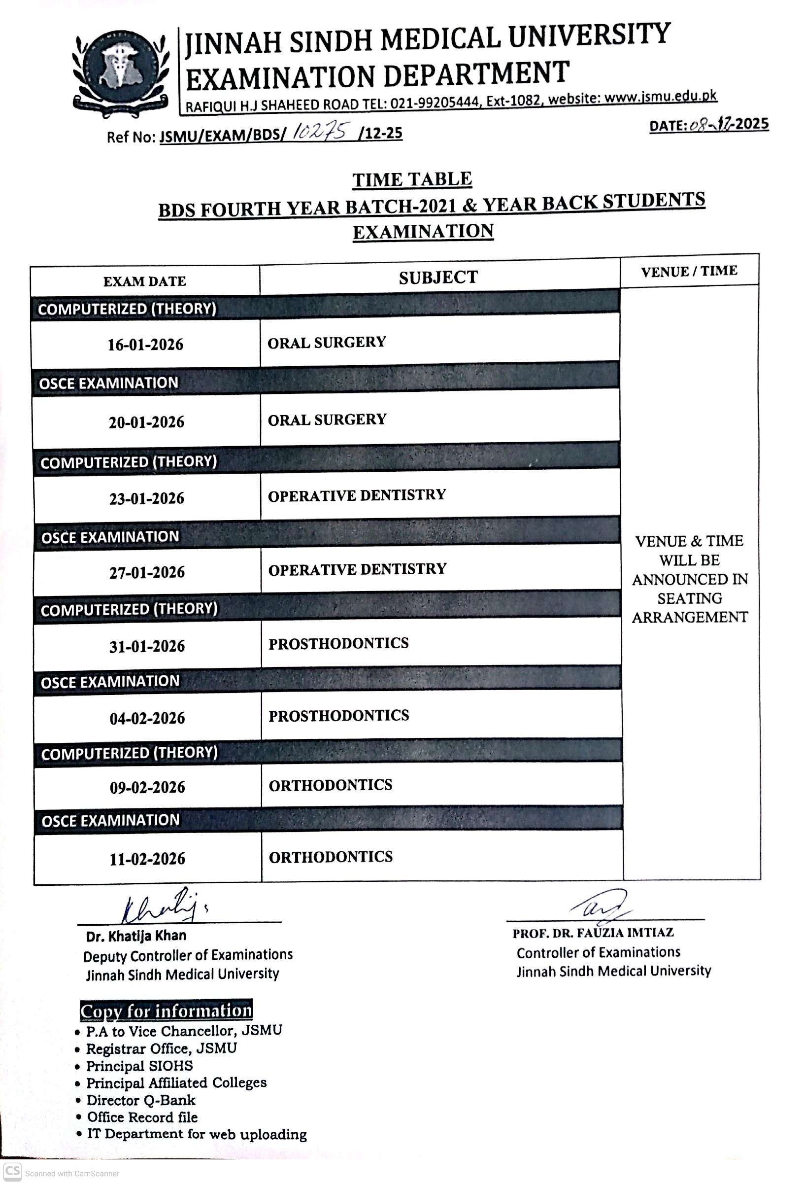 The Jinnah Sindh Medical University JSMU has officially announced the examination schedule by publishing the JSMU BDS Fourth Year Batch 2021 & YBS Exams Date Sheet 2025. This critical release provides the dates for the upcoming examinations for both the regular Batch 2021 students and the respective Year Back Students YBS.