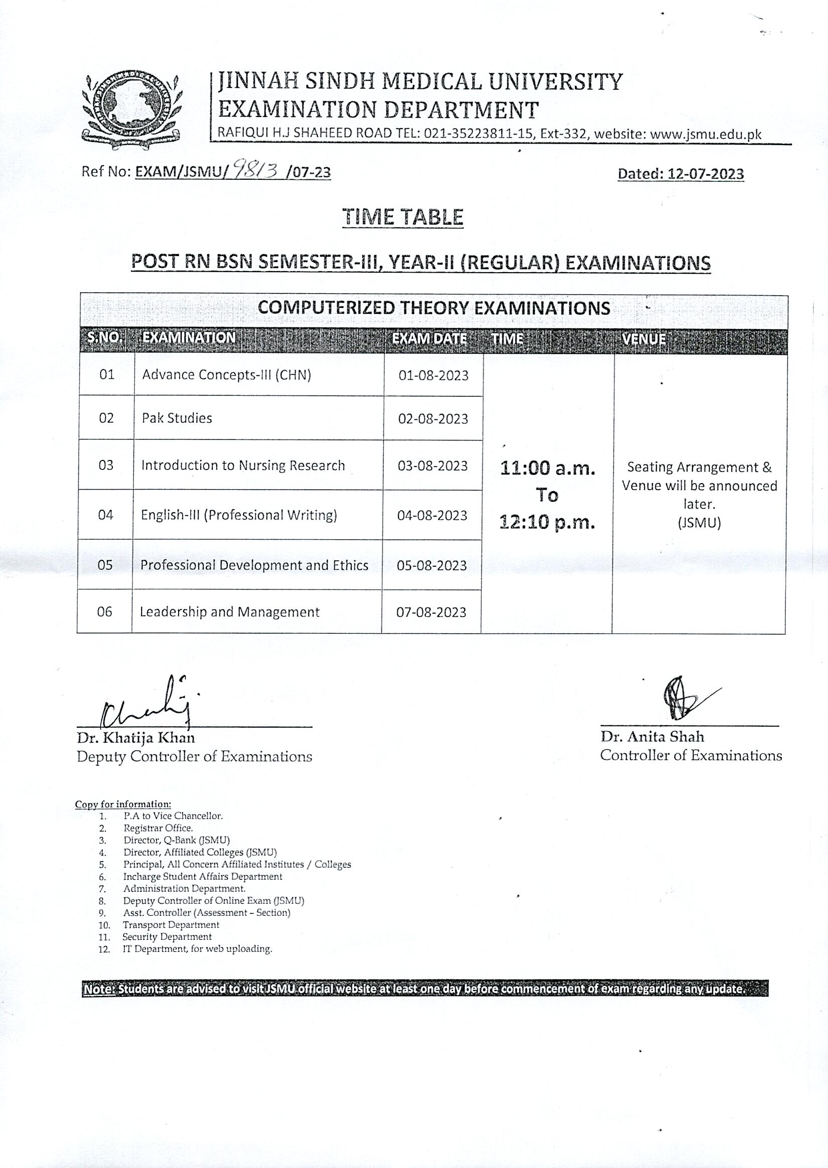 Jinnah Sindh Medical University has released the date sheet for the JSMU BS Nursing Post RN 3rd Semester Regular Exam 2023. The exams are scheduled to commence on 1st August 2023 and conclude on 7th August 2023. This announcement brings a sense of anticipation and preparation among the nursing students.