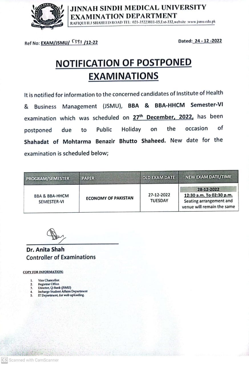 Jinnah Sindh Medical University has postponed BBA and BBA HHCM Semester VI Exam 2022. According to JSMU BBA and BBA HHCM Semester VI Examination which was scheduled on Dec 27, 2022 has now postponed till Dec 28, 2022 due to public holiday on the occasion of Shahadat of Mohtarma Benazir Bhutto. Seating arrangement and venue will remain same.