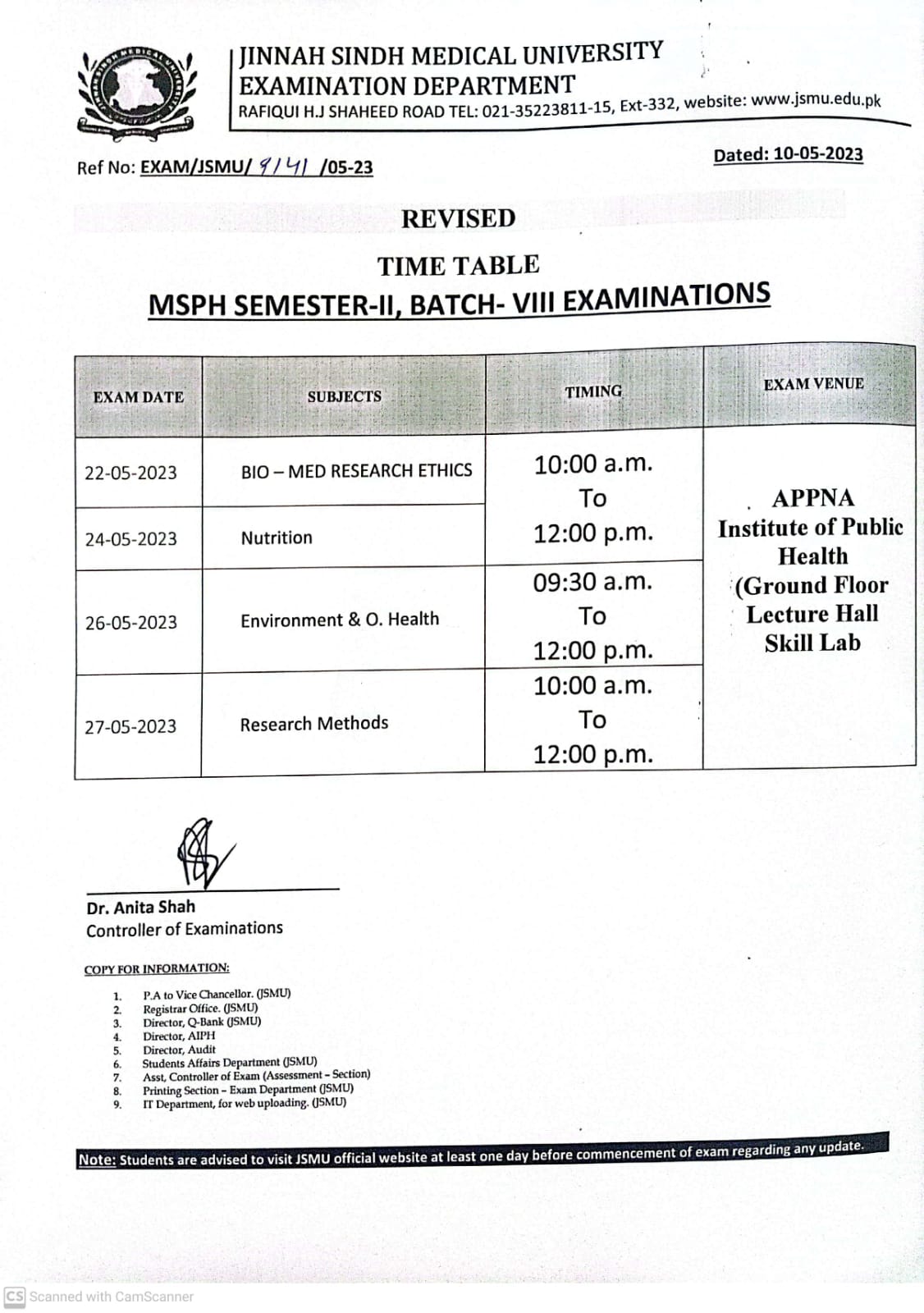 JSMU MSPH Semester II Batch VIII Revised Exam Date Sheet 2023