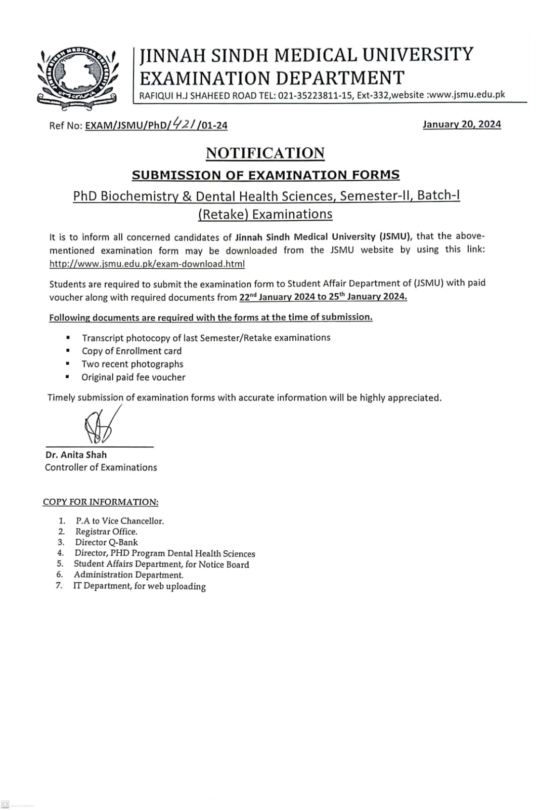 In conclusion, Jinnah Sindh Medical Universitys notification regarding the Submission of Examination Forms for PhD Biochemistry & Dental Health Sciences Semester II Batch I Retake Examinations in 2023 reflects the institutions commitment to maintaining academic standards and fostering an environment of continual improvement for its scholars.