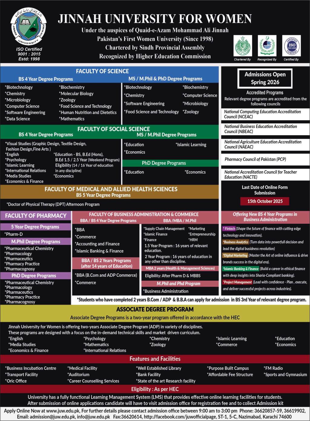 Jinnah University for Women JUW, established under the vision of Quaid-e-Azam Muhammad Ali Jinnah, proudly holds the distinction of being Pakistan’s first women’s university. Chartered by the Sindh Provincial Assembly, recognized by the Higher Education Commission HEC, and ISO 9001:2015 Certified, JUW has been setting academic standards since 1998.