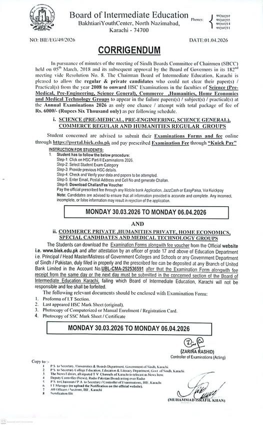 Board of Intermediate Education Karachi BIEK, in alignment with the Sindh Boards Committee of Chairmen, has opened a special one-time window for students who have failed to clear their theory or practical exams since 2008. Both regular and private candidates from Science Pre-Medical, Pre-Engineering, General, Commerce, Humanities, Home Economics, and Medical Technology groups are eligible to participate in the Annual Exams 2026. The students can get the latest updates of BIEK Special Exam Opportunity for Failure Subjects HSC 2008–Present.