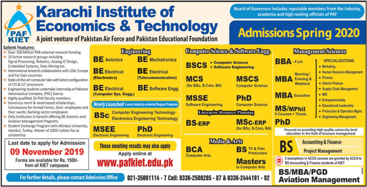 Karachi Institute of Economics & Technology has announced admissions for BE in Avionics, Electrical, Software Engineering, BS in Computer science, BSc in Computer Engineering, Electronics Engineering, MSc, MCS, M.Phil, PhD in Computer science, Electronic Engineering. Scholarships are available. Last date to apply is 09 Nov 2019.