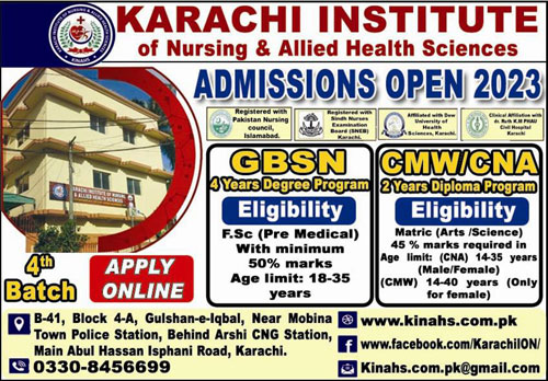 KARACHI INSTITUTE OF NURSING & ALLIED HEALTH SCIENCES Admissions 2023