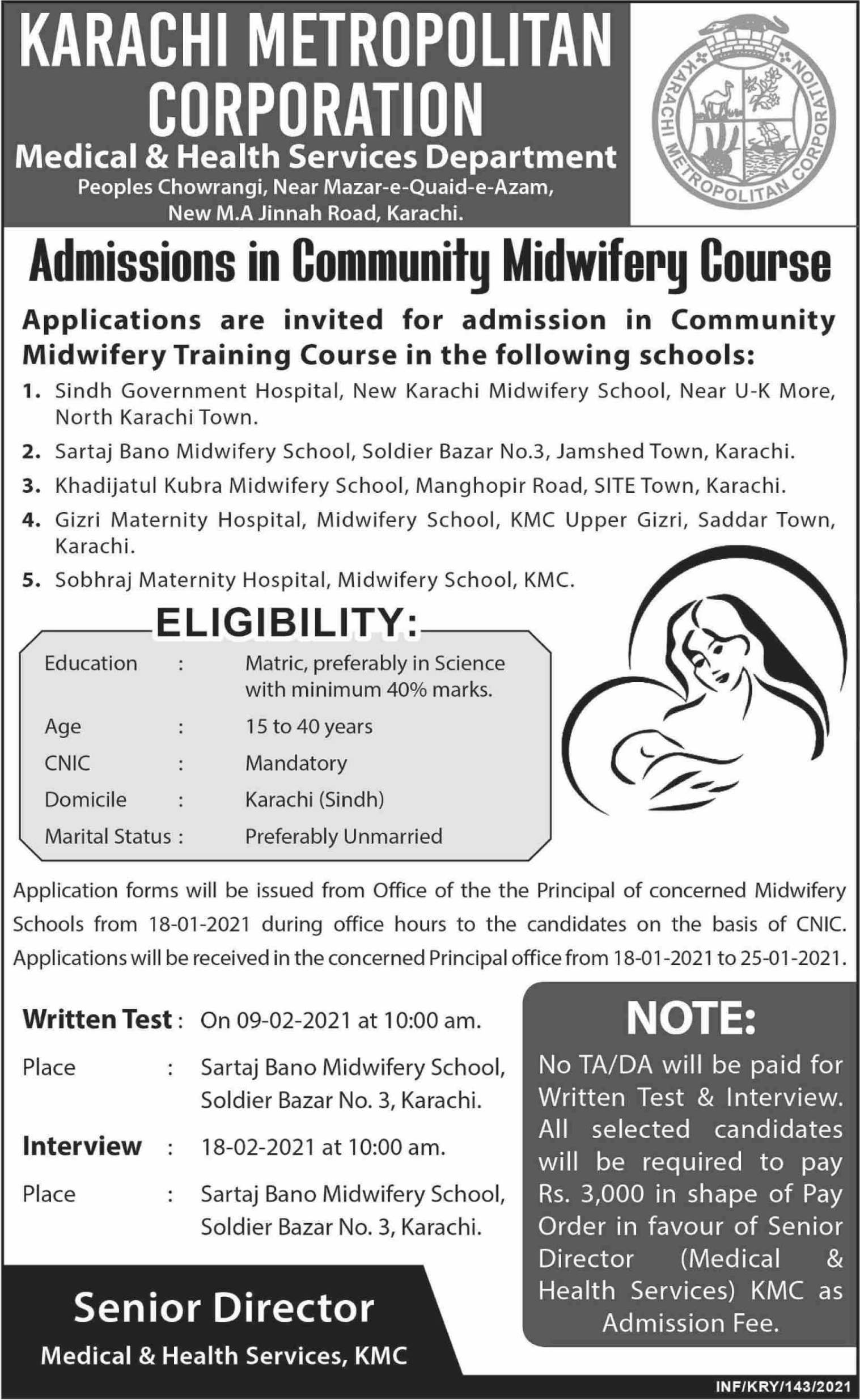 Karachi Metropolitan Corporation Medical and Health Service Department is opening Admission in Community Midwifery Course for the session of 2021.Candidates who are under 15 to 40 age can apply.Test will be held on 09-02-2021.