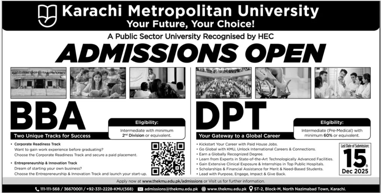 Karachi Metropolitan University KMU invites applications for its undergraduate programs, designed to equip students with practical skills, global opportunities, and professional experience. Build your future with KMU — where education meets innovation and career readiness.