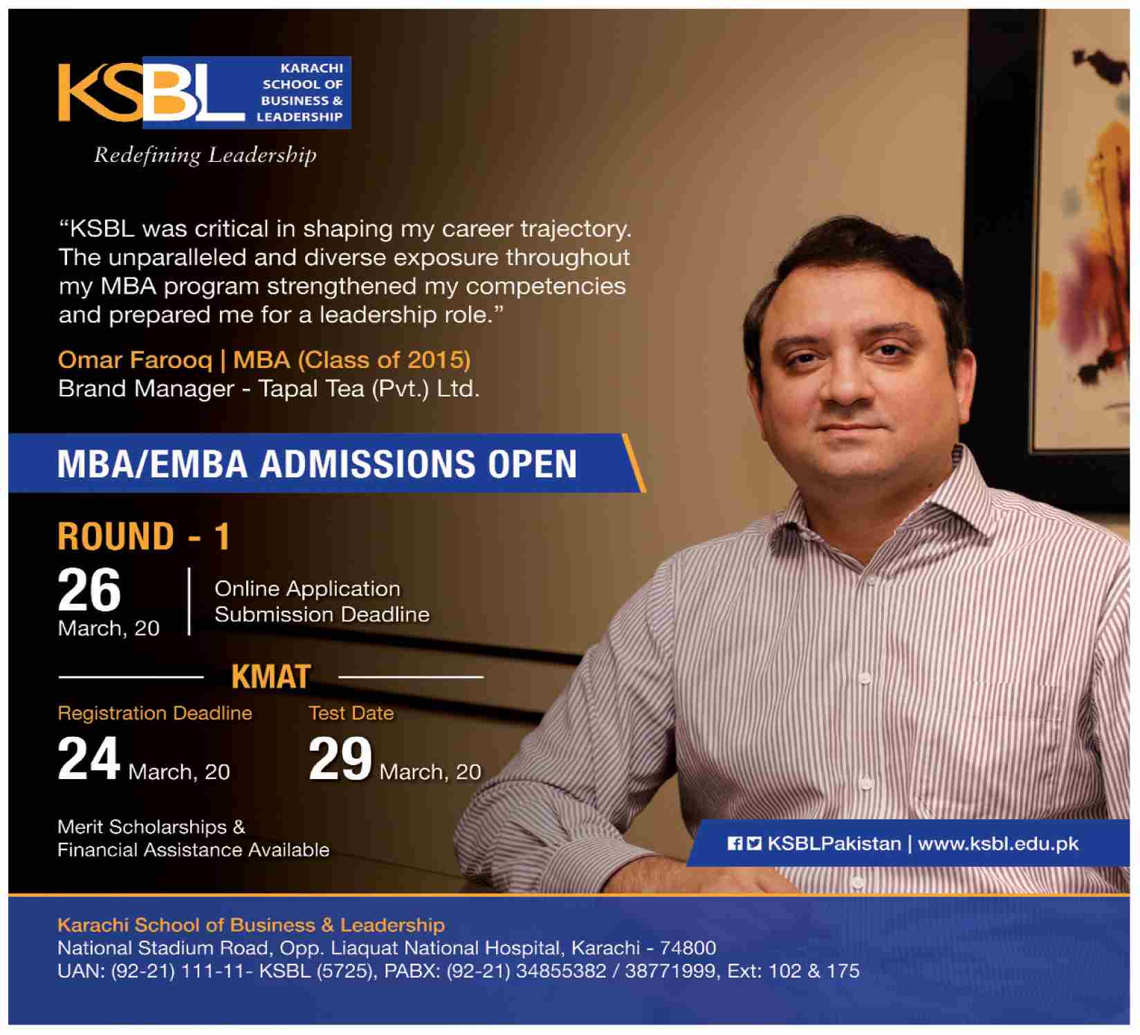 Karachi School of Business & Leadership Admission 2020 Announced for the class of MBA / EMBA . The Last date of Submission of Admission form is 24th March, 2020. The test date is 29th March, 2020.