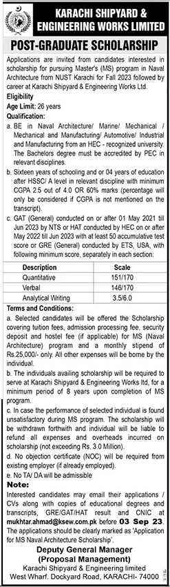 Interested candidates should send their applications/CVs, along with copies of their educational degrees, transcripts, GRE/GAT/HAT results, and CNIC online before September 3, 2023. The subject line of the email should be clearly marked as Application for MS Naval Architecture Scholarship.