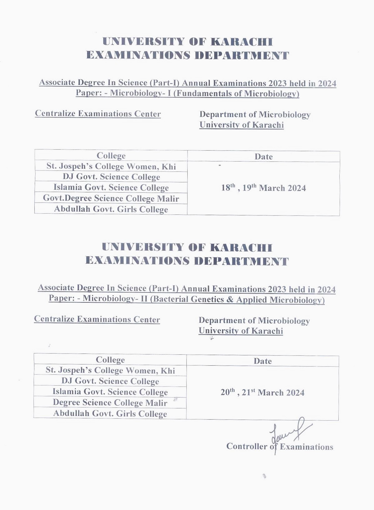 Karachi University ADS Microbiology Annual Exams 2023 Schedule 2024