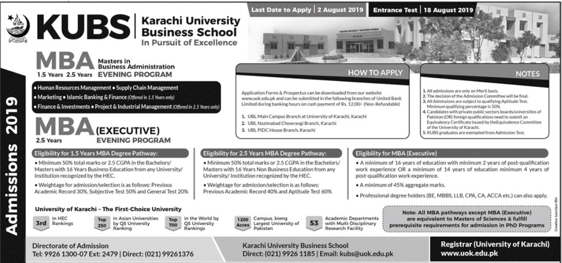 Karachi University Business School has offering the admission in MBA master in business administration which is 1.5 years evening program and MBA Executive which is 2.5 years program.
