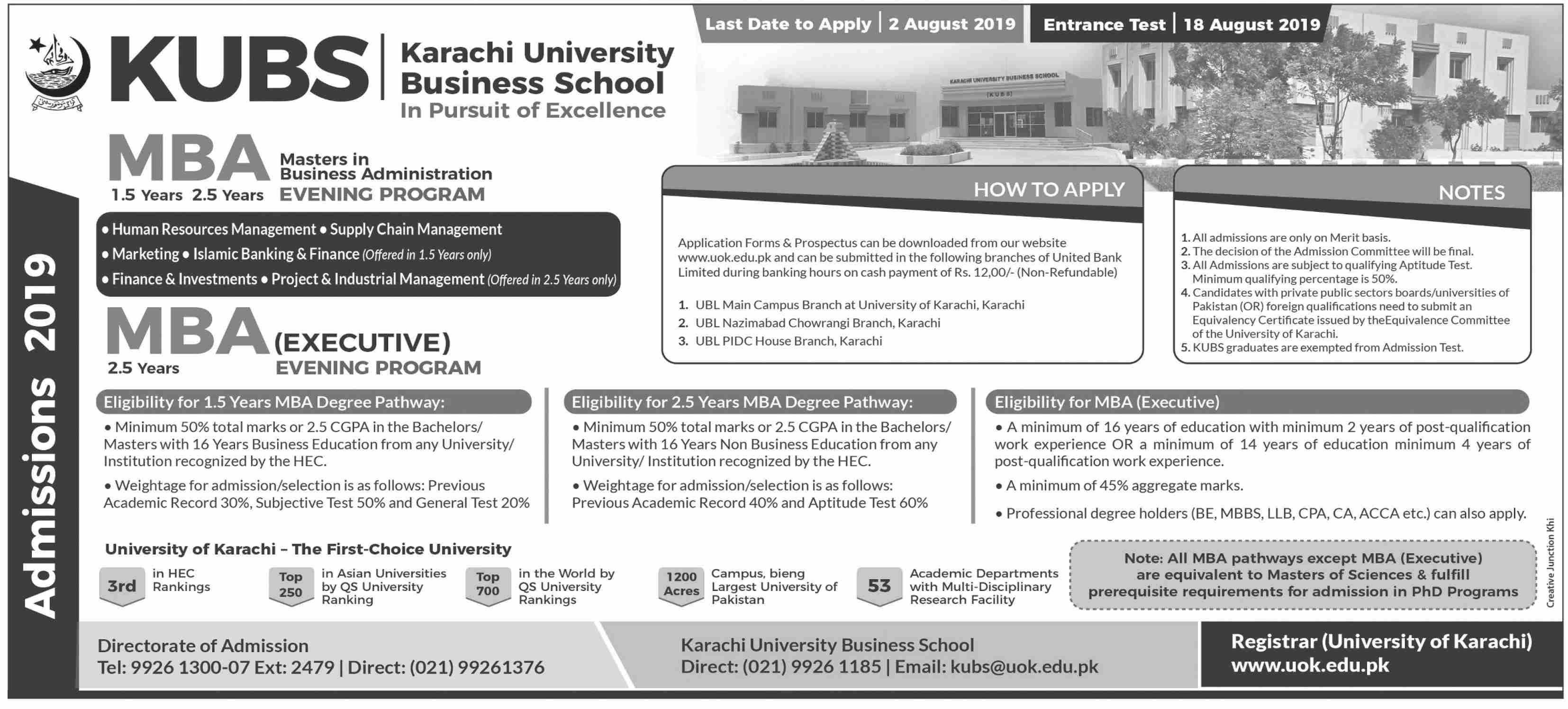 Karachi University Business School opens admission in MBS(Masters in Business Administration), MBS(Executive).